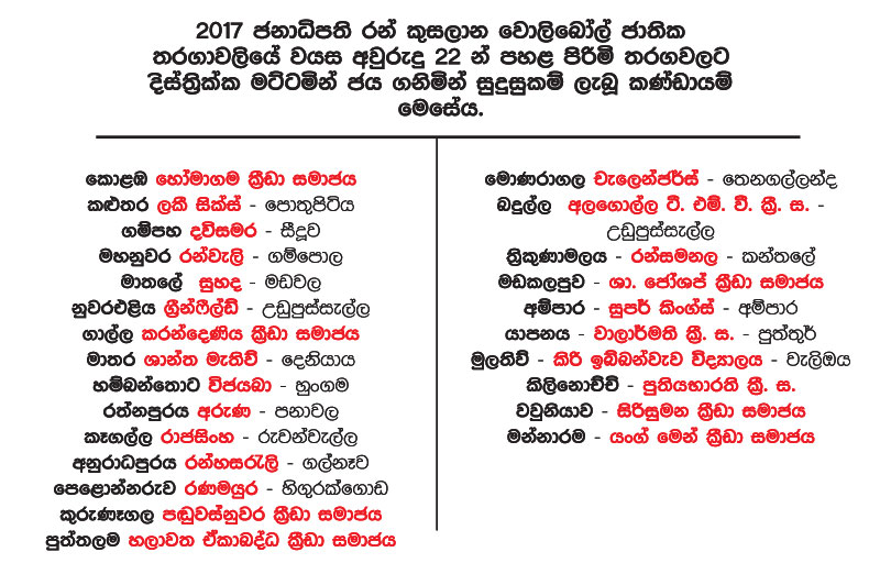 ජනාධිපති රන් කුසලාන වොලිබෝල් තරගාවලියේ වයස අවුරුදු 22 පහළ පිරිමි අවසන් මහා තරගයට හලාවත ඒකාබද්ධ ක්රීඩා සමාජය සහ හුංගම විජයබා ක්රීඩා සමාජය සුදුසුකම් ලබා තිබේ.