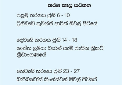 ශ්රී ලංකාව සහ බටහිර ඉන්දීය කොදෙව් අතර කොදෙව් දූපත්හි පැවැත්වීමට නියමිත තරග තුනකින් සමන්විත ටෙස්ට් තරගාවලියේ පළමු තරගය හයවැනිදා ට්රිනිඩෑඩ්හි ක්වීන්ස් පාර්ක් ඕවල් ක්රීඩාංගණයේදී ආරම්භ වෙයි.