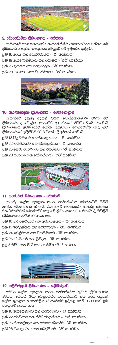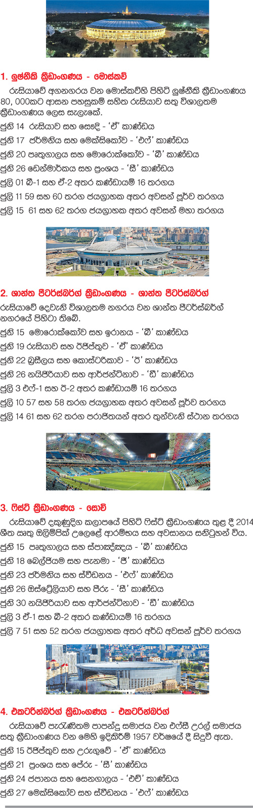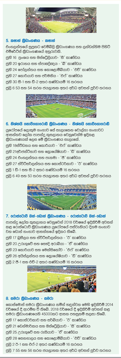 ඔලිම්පික් ක්රීඩා තරගාවලියට පසුව ලොව තිබෙන ඉහළම ක්රීඩා තරගාවලිය සේ සැලැකෙන ලෝක පාපන්දු කුසලාන තරගාවලිය මෙවර පැවැත්වෙනුයේ රුසියාවේදීය. පළමු වතාවට නැඟෙනහිර යුරෝපීය රටක පැවැත්වෙන මෙවර තරගාවලියේ කණ්ඩායම් 32 අතර තරග 65ක් පැවැත්වෙන්නේ රුසියාවේ නගර 11ක පිහිටි ක්රීඩාංගණ 12කදීයි. එම ක්රීඩාංගණ පිළිබඳ සටහනකි මේ.