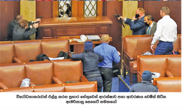 උද්ඝෝෂණ අවස්ථාවේදී සෙනෙට් සභිකයන් ආරක්ෂාව පතා මේස යටට රිංගා ආවරණ ලබා තිබේ. එසේ කිරීමට හේතුව වී ඇත්තේ උද්ඝෝෂකයන් සෙනෙට් මන්දිරයට ගල්මුල් එල්ල කිරීමය. මේ කඩාකප්පල්කාරී ක්‍රියා හේතුවෙන්ම නගරයට දැඩි සේ ඇඳිරි නීතිය පනවා ඇති අතර නගර වැසියන්ට අත්‍යවශ්‍ය කරුණකට හැර නිවෙස්වලින් පිටවීම තහනම් කර තිබේ. ලබන විසි වැනිදා ජයග්‍රහාක ජෝ බයිඩ්න් ජනාධිපතිධූරයේ දිවුරුම් දීමට නියමිත අතර ඒ වන විට ට්‍රම්ප් කිනම් අන්දමකින් කටයුතු කරයිද යන්න සැකසහිත බව සිදුවෙමින් පවතින මේ සිදුවීම් දෙස බැලූ විට තහවුරු වේ. ඒ සමඟින් මෙම විරෝධතා හේතුවෙන් බ්‍රහස්පතින්දා සවස් වන විට මියගිය සමස්තය පහ දක්වා ඉහළ ගොස් තිබේ