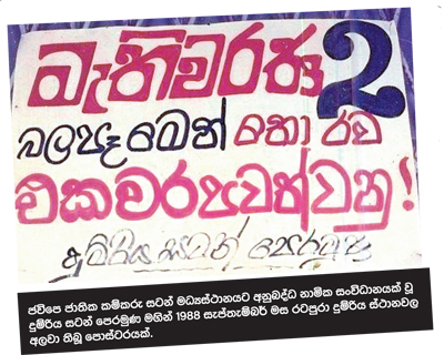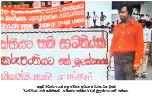 වසර 1971 කැරැල්ලේ පරාජයෙන් පසු බන්ධනාගාරයෙන් 1977 නොවැම්බර් නායක විජේවීර ඇතුළු පිරිස නිදහස් වූ විට කම්කරුවන් සූදානම් කිරීම සම්බන්ධයෙන් ජවිපෙ ස්ථාවරය වූයේ ඔවුන්ගේ පෞද්ගලික දේශපාලන බැ`දියාව සැලකිල්ලට ගැනීමෙන් තොරව එක් වෘත්තියක් සඳහා එක් වෘත්තීය සමිතියක් පිහිට විය යුතු බවය. අසූවේ ජූලි වැඩවර්ජනයෙන් පසු ජවිපෙ විසින් ‘වෘත්තියට තනි සමිතියක්-කම්කරු පන්තියට එක් මූලස්ථානයක්’ යන සටන් පාඨය යළි සිය ප්රධාන සටන් පාඨයක් බවට පෙරට ගෙන එන ලදී.