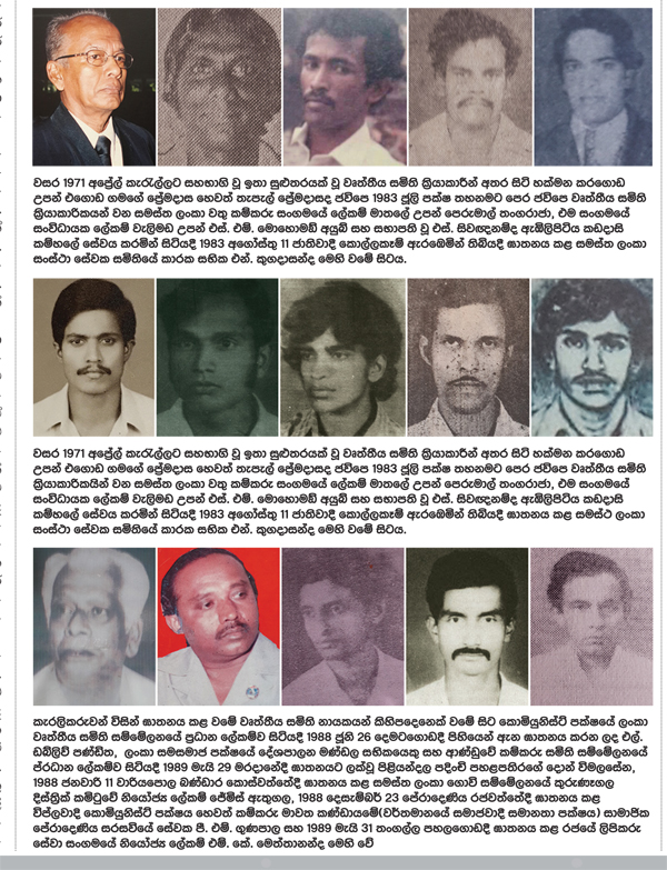 ජවිපෙ දෙවැනි කැරැල්ලේදී ජවිපෙ වෘත්තීය සමිති ක්රියාකාරිකයන් ගණනාවක් ම ආරක්ෂක හමුදා සහ අතුරු හමුදා කණ්ඩායම් මඟින් ඝාතනයට පත්විය. ඒ අතර ඔරුවල වානේ සංස්ථාවේ ශාඛා ලේකම් රංජිත් පෙරේරා සහ ඇඹිලිපිටිය කඩදාසි කම්හලේ ශාඛා ලේකම් බී. ඩී. බන්දුවර්ධන, ලංගම සටහන් පෙරමුණේ රත්මලානේ ඩිපෝවේ නායකයන් වූ කේ. කේ. සිල්වා සහ ඇක්මන් රණතුංග ඇතුළු කිහිපදෙනෙක්ම වේ.