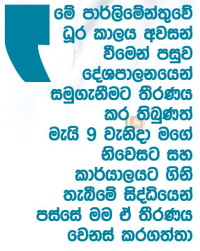 “දේශපාලනික වශයෙන් මා තුළ කලකිරීමක් ඇතිවීමට හේතු වුණේ මැයි 9 වැනිදා සිදුවීම නෙවෙයි. ඊට පෙර ඇතිවූ තත්ත්වයක්. එවකට පැවති ආණ්ඩුවට සහයෝගය දැක්වීමට මම ගත් තීරණය ගැන ශ්‍රී ලංකා නිදහස් පක්ෂයේ ඇතැම් දේශපාලඥයන් මට ප්‍රසිද්ධියේ චෝදනා කළා. ශ්‍රී ලංකා නිදහස් පක්ෂය ආණ්ඩුවෙන් ඉවත් වී ස්වාධීන වීමට තීරණය කළ අවස්ථාවේ මගේ අදහස වුණේ ආර්ථික අර්බුදයක් තියෙන අවස්ථාවක ආණ්ඩුව දුර්වල කිරීම හොඳ නැහැ, අපි රජයේ කටයුතුවලට සහයෝගය දිය යුතු බවයි. නමුත් බොහෝදෙනා මගේ අදහසට විරුද්ධව විවිධ අසත්‍ය ප්‍රචාර ගෙනගියා. මම කෘෂිකර්ම රාජ්‍ය ඇම­ැතිකම ගත්තේ මුදල් අරගෙන කිව්වා. ඒ අසත්‍ය චෝදනා හේතුවෙන් මම දැඩි කලකිරීමටත් කම්පාවටත් පත්වුණා. ඒ කලකිරීම නිසාම මේ 9 වැනි පාර්ලිමේන්තුවේ ධූර කාලය අවසන් වීමෙන් පසුව මම දේශපාලනයෙන් සමුගන්නයි තීරණය කරලා තිබුණේ. නමුත් මැයි 9 වැනිදා මගේ නිවෙසට සහ කාර්යාලයට ගිනි තැබීමේ සිද්ධියෙන් පස්සේ මම ඒ තීරණය වෙනස් කරගත්තා. ”