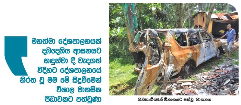 “මේ ක්‍රියාවට සම්බන්ධ දෙපාර්ශ්වයක් ඉන්නවා. මම එදා සිටම අපේ ප්‍රදේශයේ නීති විරෝධී මත්පැන් සහ මත්ද්‍රව්‍ය ජාවාරමේ සහ ඒවා භාවිත කරන පුද්ගලයන්ට විරුද්ධව කටයුතු කළා. ඒ නිසා ඒවාට සම්බන්ධ පුද්ගලයන් මා සමඟ දැඩි කෝපයෙන් පසුවූ බව රහසක් නෙවෙයි. ඔවුන් තමයි මුලින්ම මේ සිද්ධිය පටන් ගත්තේ. ඒ වගේම මැතිවරණවලදී මගේ ජයග්‍රහණය වැළැක්වීමට කටයුතු කළ ප්‍රධාන පක්ෂ දෙකක සාමාජිකයන් මේ සිදුවීම පිටුපස සිටිනවා. බොහෝ අය හිතුවේ මැයි 9 වැනිදා මේ ප්‍රචණ්ඩකාරී සිදුවීම් කළේ ආණ්ඩුව ගැන ක්ෂණික කෝපයෙන් කියලා. ඒත් මොන හේතුවක් මත වුණත් තවත් කෙනෙක්ගේ නිවෙසක් ගිනි තියන්න තරම් විනාශකාරී හැඟීම්වලින් හැසිරෙනවා නම් ඒ තුළ තිබෙන්නේ වෛරී සහගත සිතිවිල්ලක් පමණයි. නිවෙස ගිනිතැබීමෙන් මගෙත් බිරියගේත් දරුවන්ගේත් වටිනා ලියකියවිලි ඇතුළු සියලුම දේවල් විනාශ වුණා.