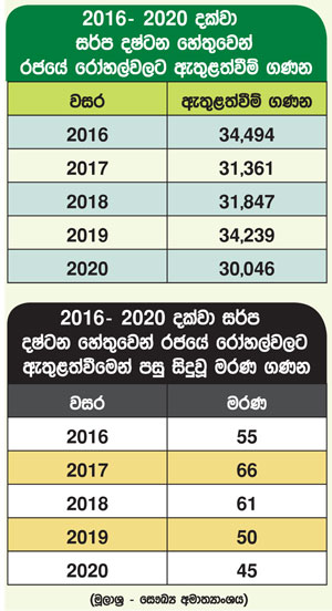 වසරක් පාසා සර්ප දෂ්ටන මෙන්ම සර්ප දෂ්ටන නිසා අසන්නට සිදු වූ මරණ ද නිමක් නැත. බොහෝමයක් වාර්තා නොවන්නේ ගමේ සර්ප විෂ වෙද මහතා සොයා ගොස් ප්රතිකාර ලබන්නවුන් ගැන කිසිදු තැනක වාර්තා නොවන නිසාය. පේරාදෙණි විශ්වවිද්යාලයේ මහාචාර්ය එස්. එම්. ඒ. කුලරත්න පවසන්නේ වර්ෂයකට සිදු වන සර්ප දෂ්ට මරණ 50 ඉක්මවන බවකි. එසේම වසරකට සර්ප දෂ්ටනයට ලක් වන පිරිස 40,000 ඉක්මවන බවකි. ඒ සියල්ල වාර්තා වූ ඒවා වන අතර, වාර්තා නොවූ ඒවා ද තව බොහෝය.